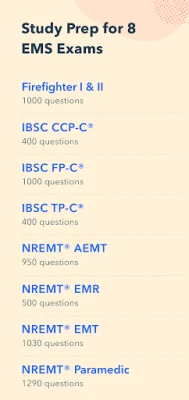 Unlock thousands of EMS certification exam practice questions and mock exams for the NREMT EMT, NREMT Paramedic, Firefighter I & II, IBSC FP-C, and more with Pocket Prep, the largest provider of mobile test prep for professional certifications.
