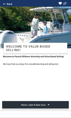 Welcome to the Pursuit Offshore University Learning & Engagement Platform! This app is designed to give professional sales coaching for your dealership as well as high quality marketing materials and product information for the Pursuit Boats brands. We hope that you enjoy this valuable learning and selling tool.