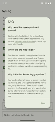 * Last kernel log (last_kmsg, if device supports it)